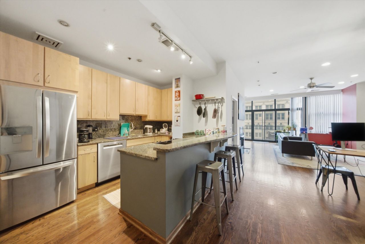 Experience the unmatched charm of this one-of-a-kind condo at Metropolitan Place in the heart of the vibrant West Loop. This spacious 2-bedroom, 2-bath split floor plan with desirable southern exposure offers an open-concept layout featuring soaring ceilings, hardwood floors throughout, a cozy gas fireplace, and beautiful views from your private balcony. The open kitchen is appointed with maple cabinetry, stainless steel appliances, and an expansive breakfast bar with ample seating-perfect for entertaining. The generously sized primary suite provides a true retreat, complete with a luxurious en-suite bath and a large walk-in closet. The fully enclosed second bedroom is spacious and conveniently located near an updated full bath. Additional features include an in-unit washer and dryer, excellent sound insulation, and heated garage parking available for $35,000. Metropolitan Place is a professionally managed building offering 24-hour door staff, a fitness center, and a beautifully maintained courtyard and sundeck. Ideally situated just steps from Union Station, the Loop and West Loop's renowned dining and nightlife, public transportation, expressways, and the Riverwalk directly across the street! Explore the property in 3D-click the 3D tour button to take a virtual walk-through of every detail.