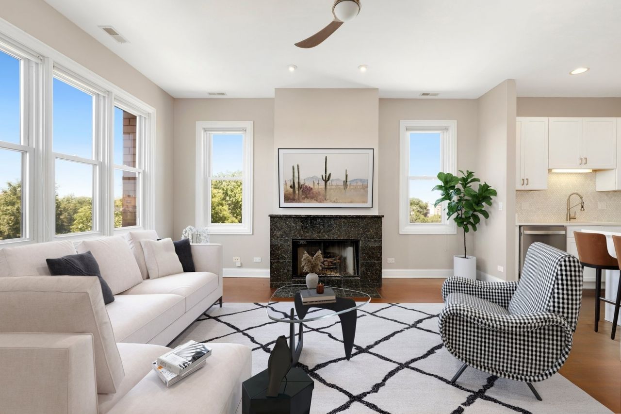 Experience the elevated perspective of this rare corner penthouse, where clearing the neighboring rooftops allows for a spectacular 270-degree flow of natural light. Positioned on a serene, tree-lined street at the intersection of East Bucktown and Lincoln Park, this three-bedroom residence offers a sophisticated urban retreat with soaring ten-foot ceilings and an expansive open-concept layout. The heart of the home is a chef-inspired kitchen featuring timeless white quartz countertops, 42-inch cabinetry, and a marble backsplash, all flowing seamlessly into a bright living and dining area anchored by a classic stone-mantle gas fireplace. It is a space designed for effortless transitions between quiet mornings and vibrant evening entertaining. The primary suite serves as a true sanctuary, complete with a private outdoor balcony and a spa-inspired bath featuring a double vanity, a deep soaking tub, and an oversized walk-in shower. Two additional well-proportioned bedrooms provide the versatility modern buyers crave, whether utilized as high-end guest quarters or a dedicated home office. Freshly painted in a contemporary neutral palette and featuring refinished hardwood floors throughout, the home offers practical peace of mind alongside significant infrastructure, including high-capacity laundry, ample integrated storage, and a secured gated parking space. Residents enjoy unparalleled access to the best of Chicago living, from the nearby 606 Trail and the boutiques of Damen Avenue to the effortless commute provided by the Clybourn Metra and the Kennedy Expressway. This is a pristine, move-in-ready opportunity to own a bright, airy piece of one of the city's most sought-after neighborhoods. Located within the award winning Pulaski school district.