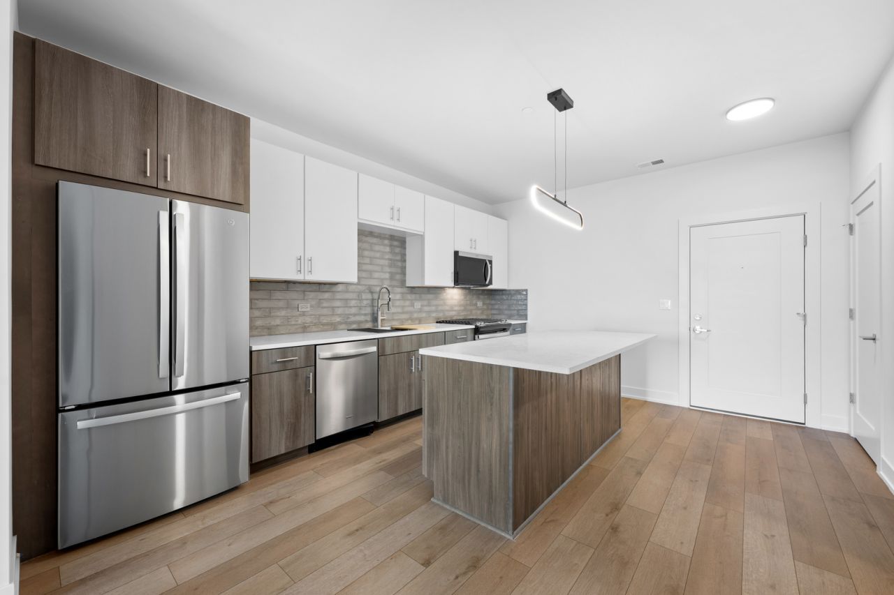 This new apartment features an open floor plan with a full kitchen, complete with an eat-in island, stainless steel sink with pull-out faucet, dishwasher, refrigerator, gas range, and microwave. The living area includes an in-unit full size washer and dryer and opens to a large private balcony. The bedroom offers a custom shelving closet, and all windows are outfitted with custom shades throughout the home. Includes its own furnace and hot water heater.
